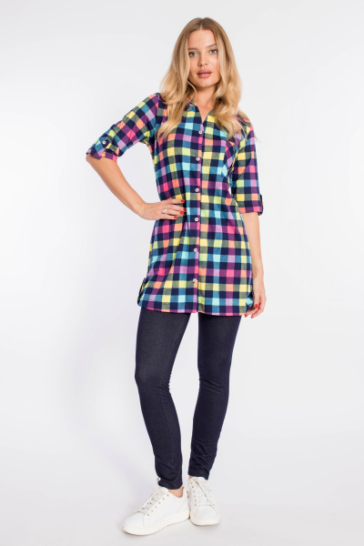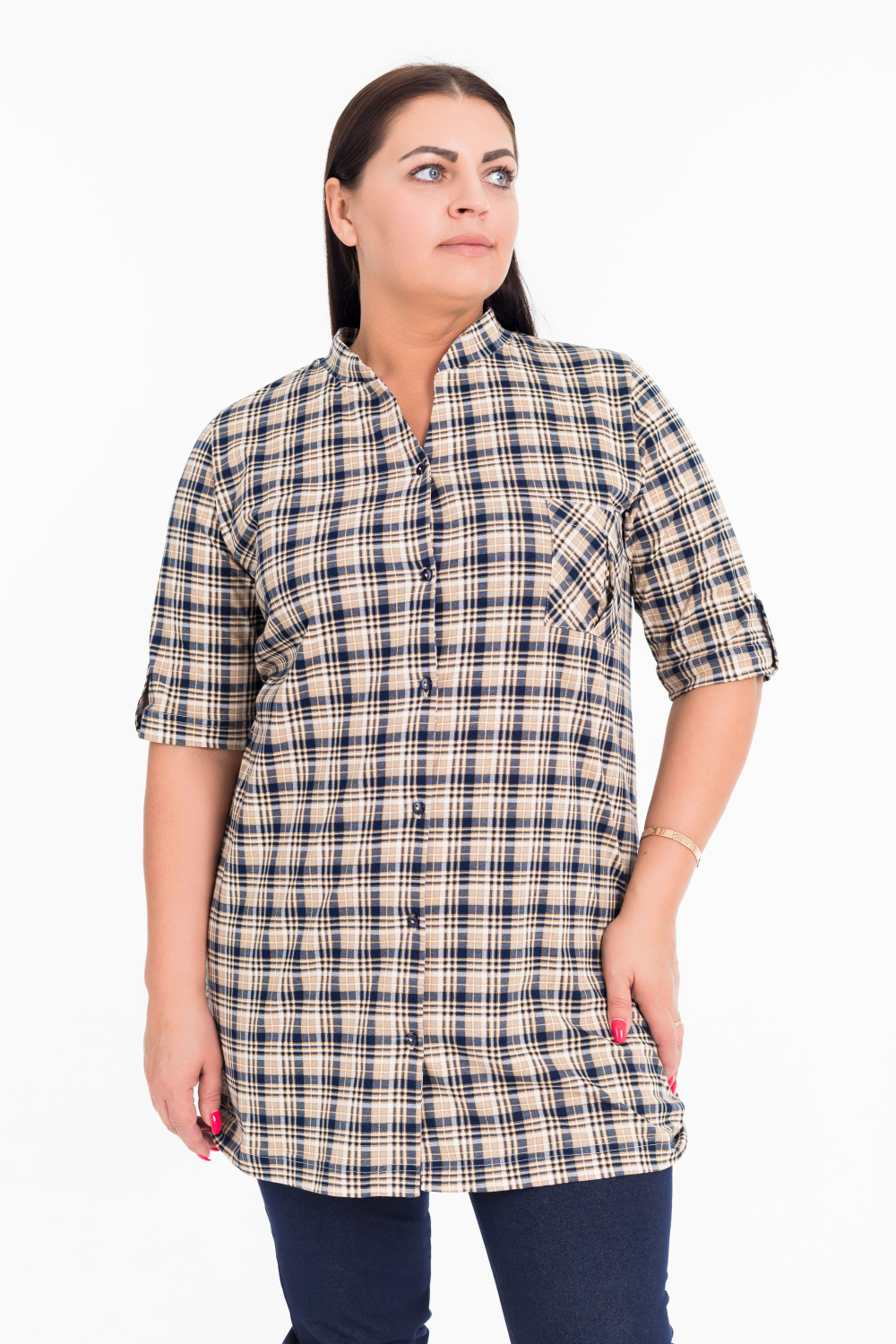 Рубашка с рукавом длиной 3/4 и центральной застёжкой на пуговицы. Воротник-стойка, спереди накладной карман, на рукавах и снизу по бокам отделка паты.