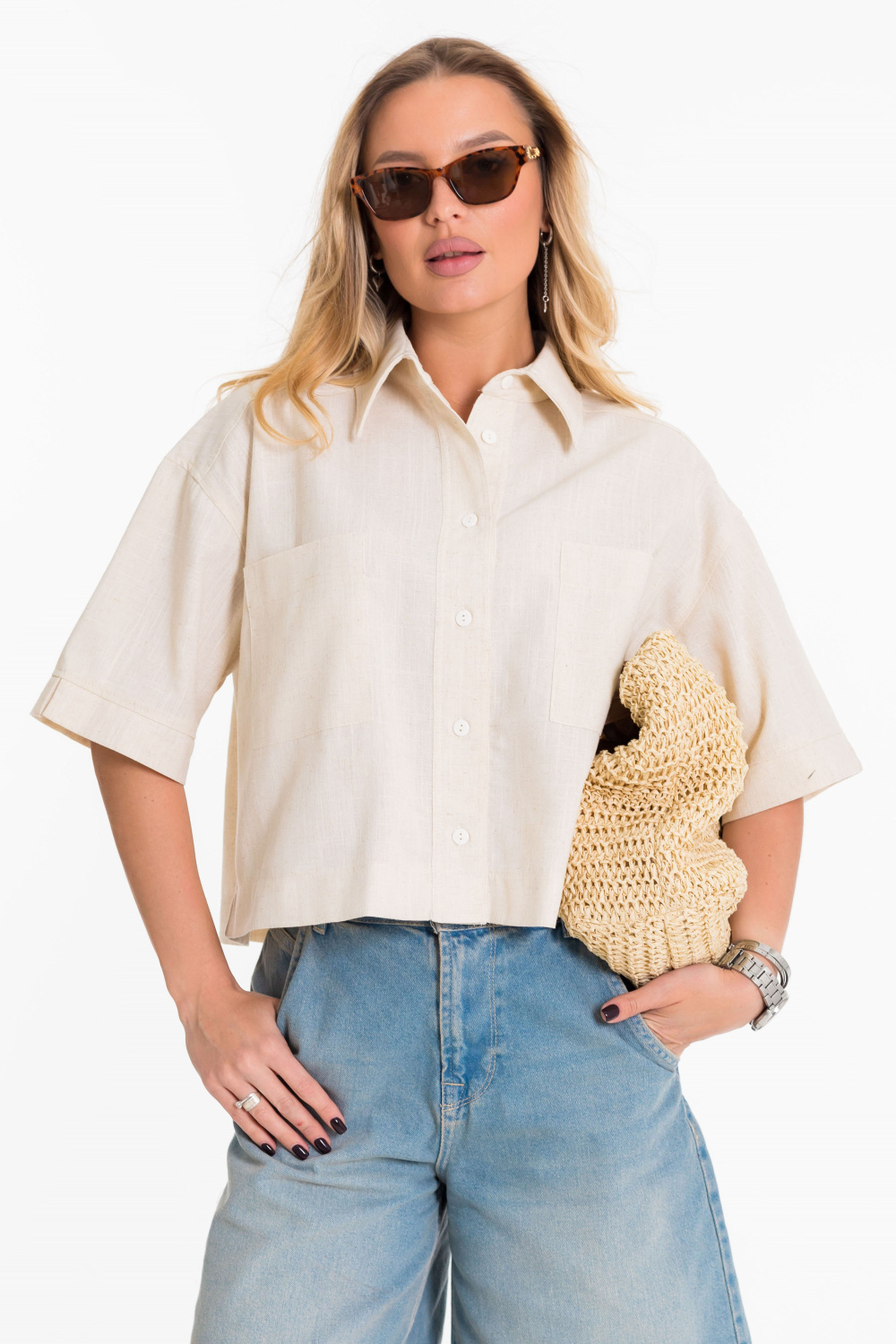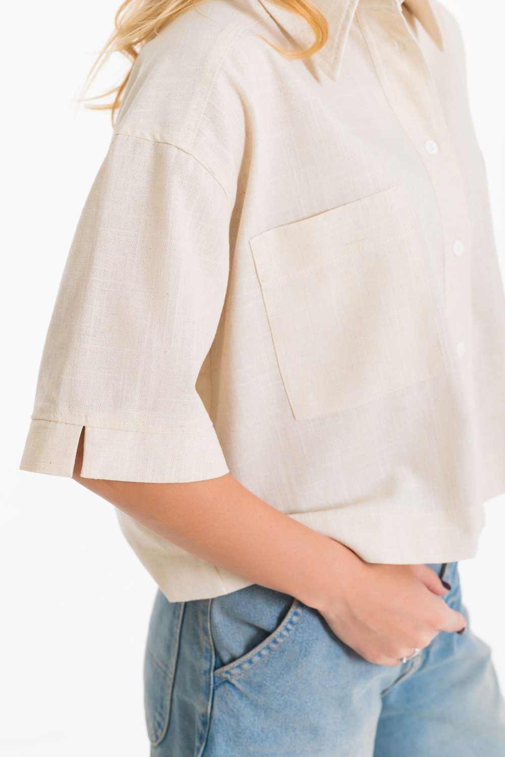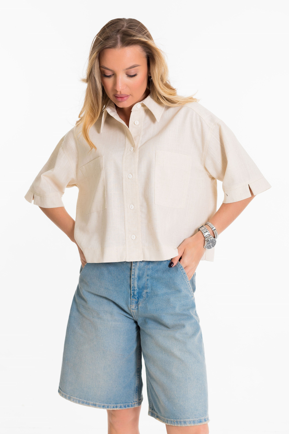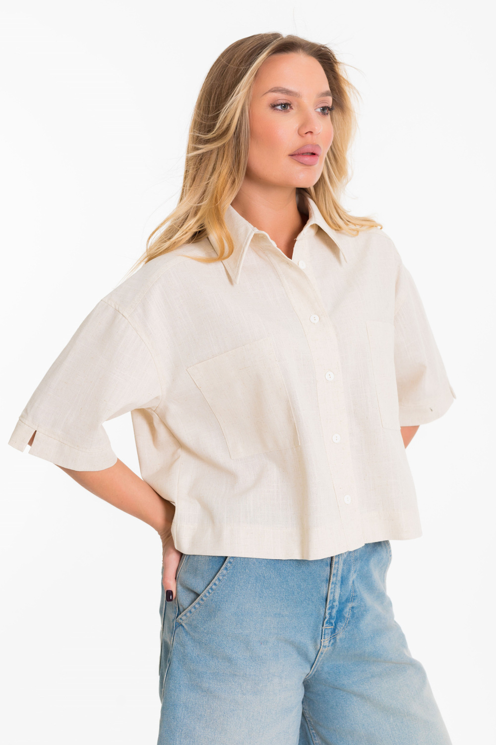 Рубашка выполнена из однотонного натурального льна с вискозой. Рубашка короткая, свободного силуэта с застёжкой на пуговицы спереди. Воротник на отрезной стойке, спереди размещены накладные карманы, рукава короткие с притачной планкой.