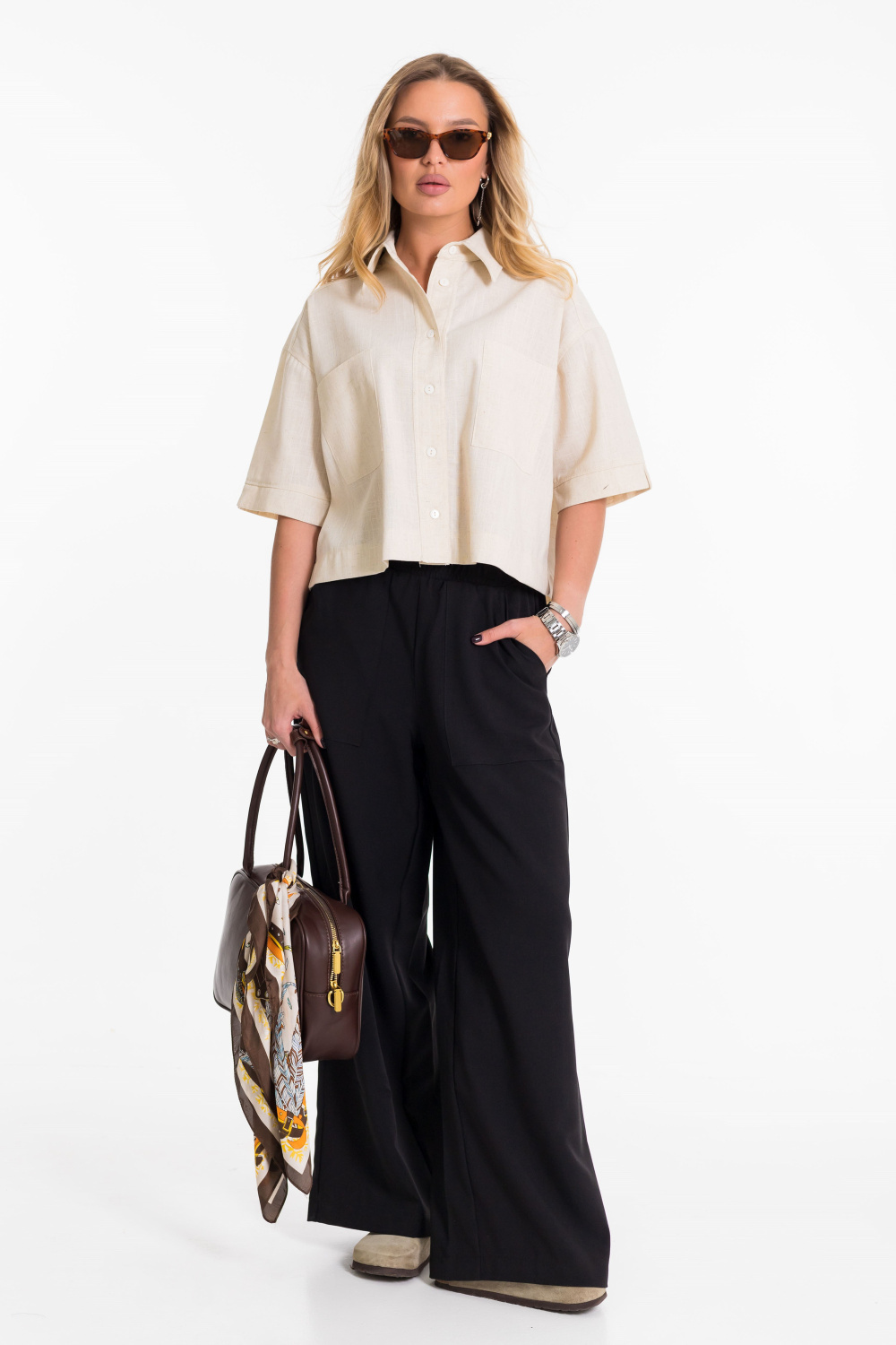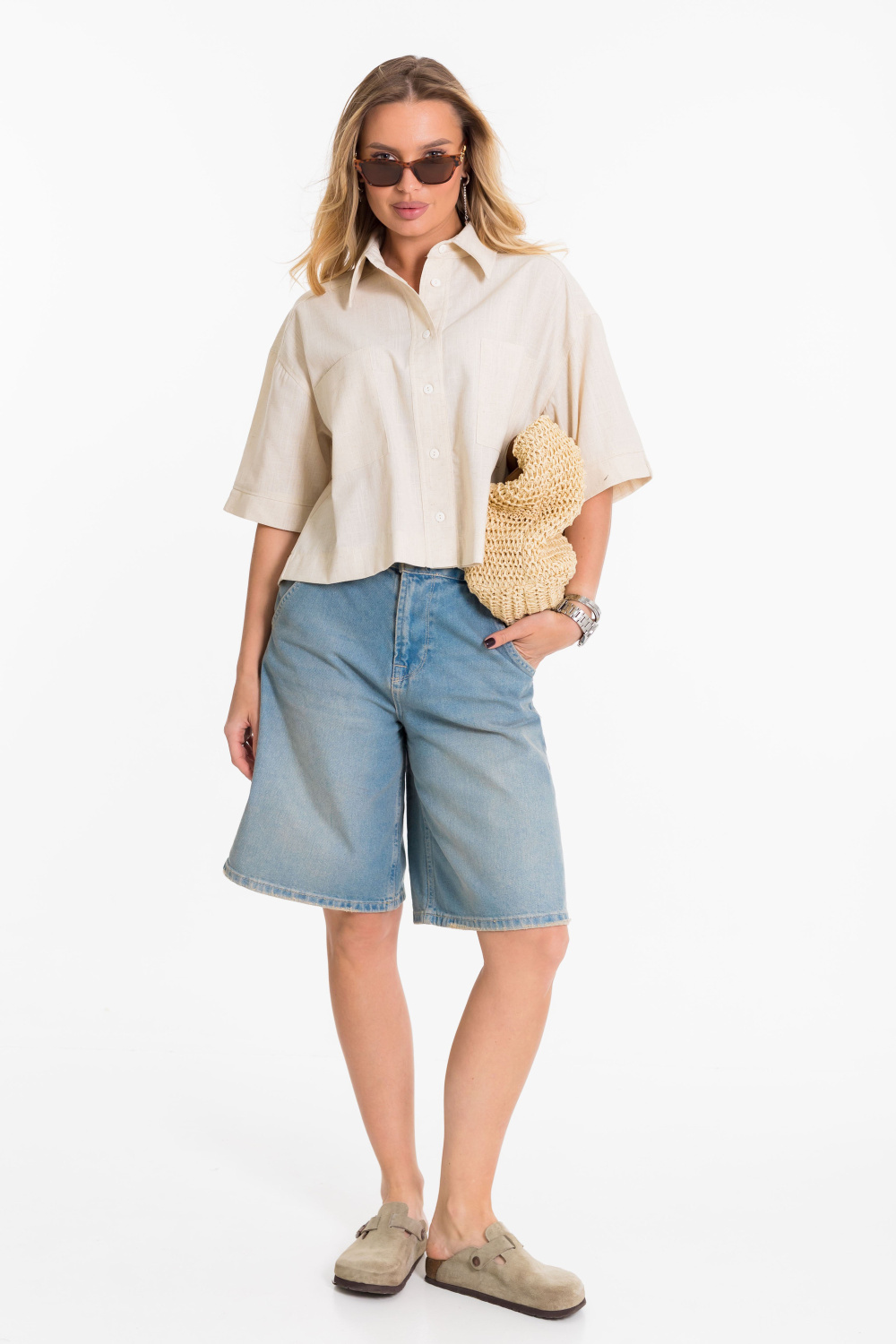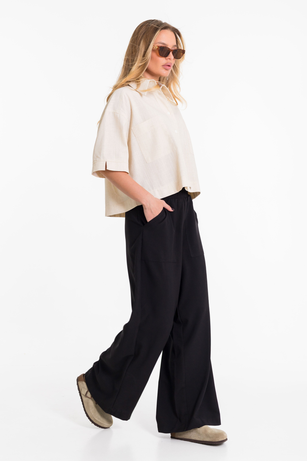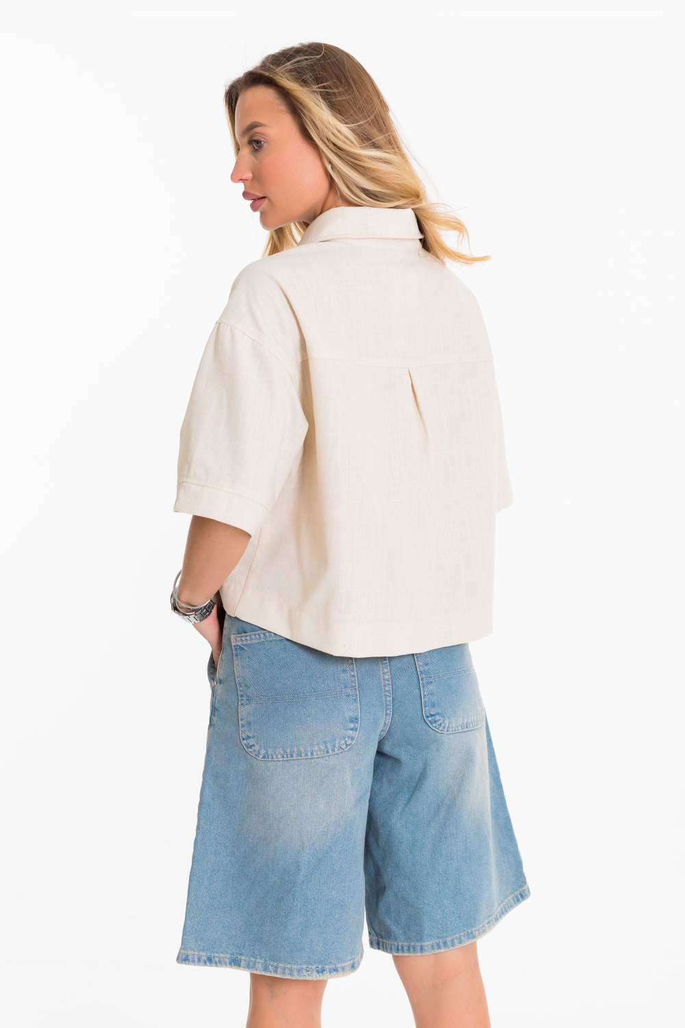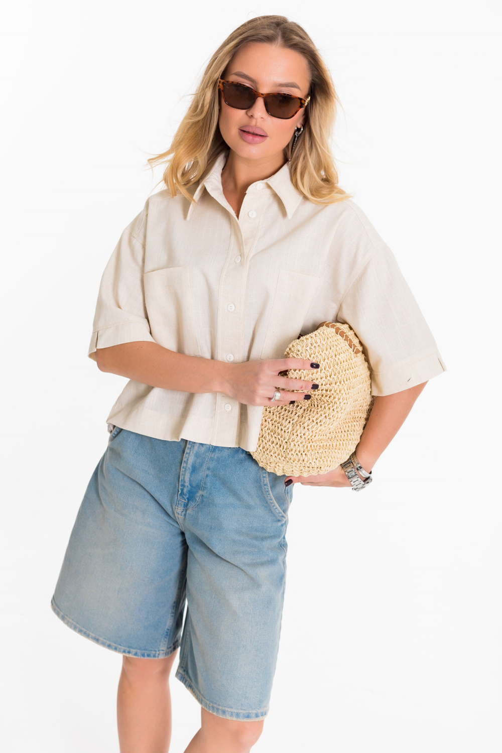Рубашка выполнена из однотонного натурального льна с вискозой. Рубашка короткая, свободного силуэта с застёжкой на пуговицы спереди. Воротник на отрезной стойке, спереди размещены накладные карманы, рукава короткие с притачной планкой.