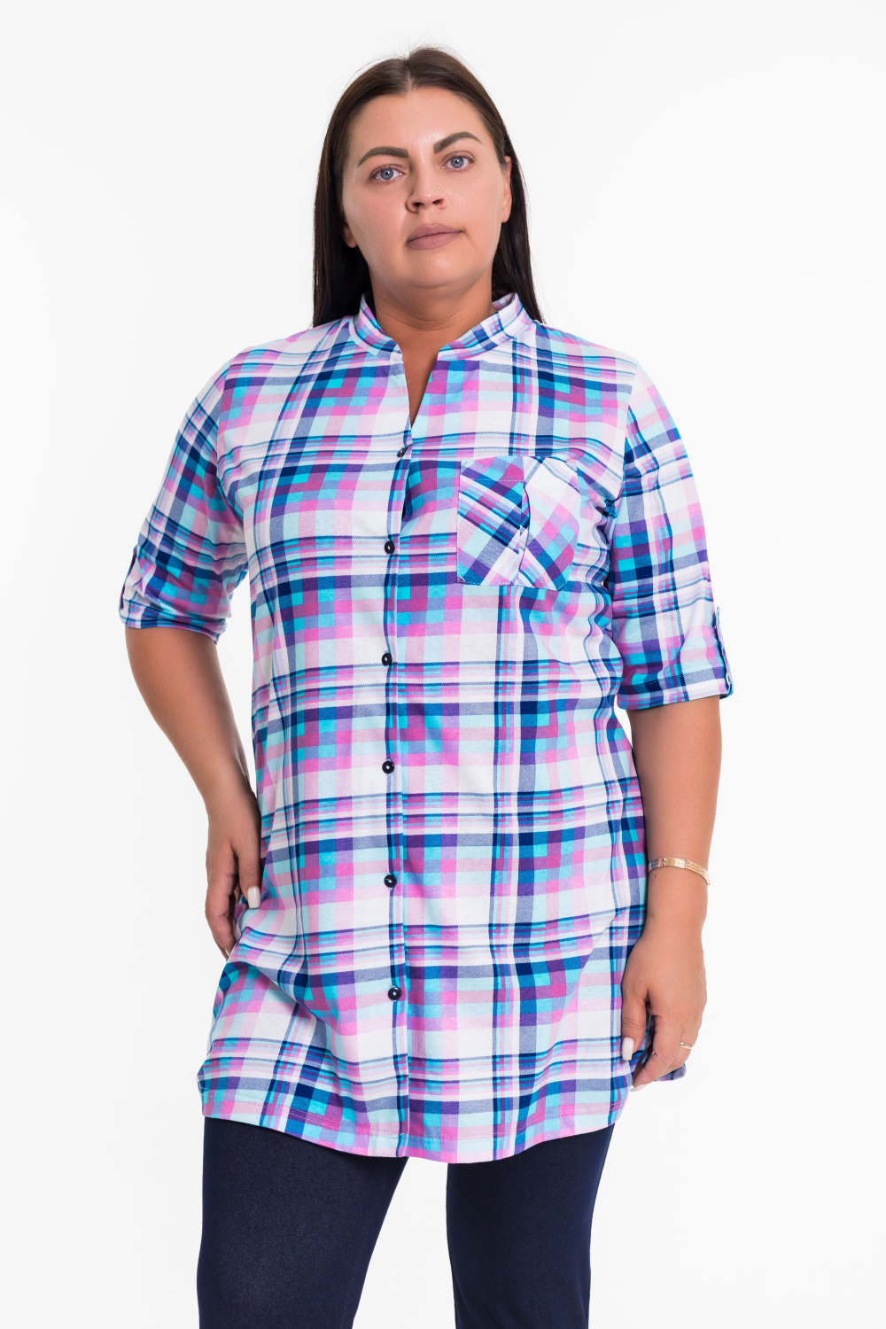 Рубашка с рукавом длиной 3/4 и центральной застёжкой на пуговицы. Воротник-стойка, спереди накладной карман, на рукавах и снизу по бокам отделка паты.