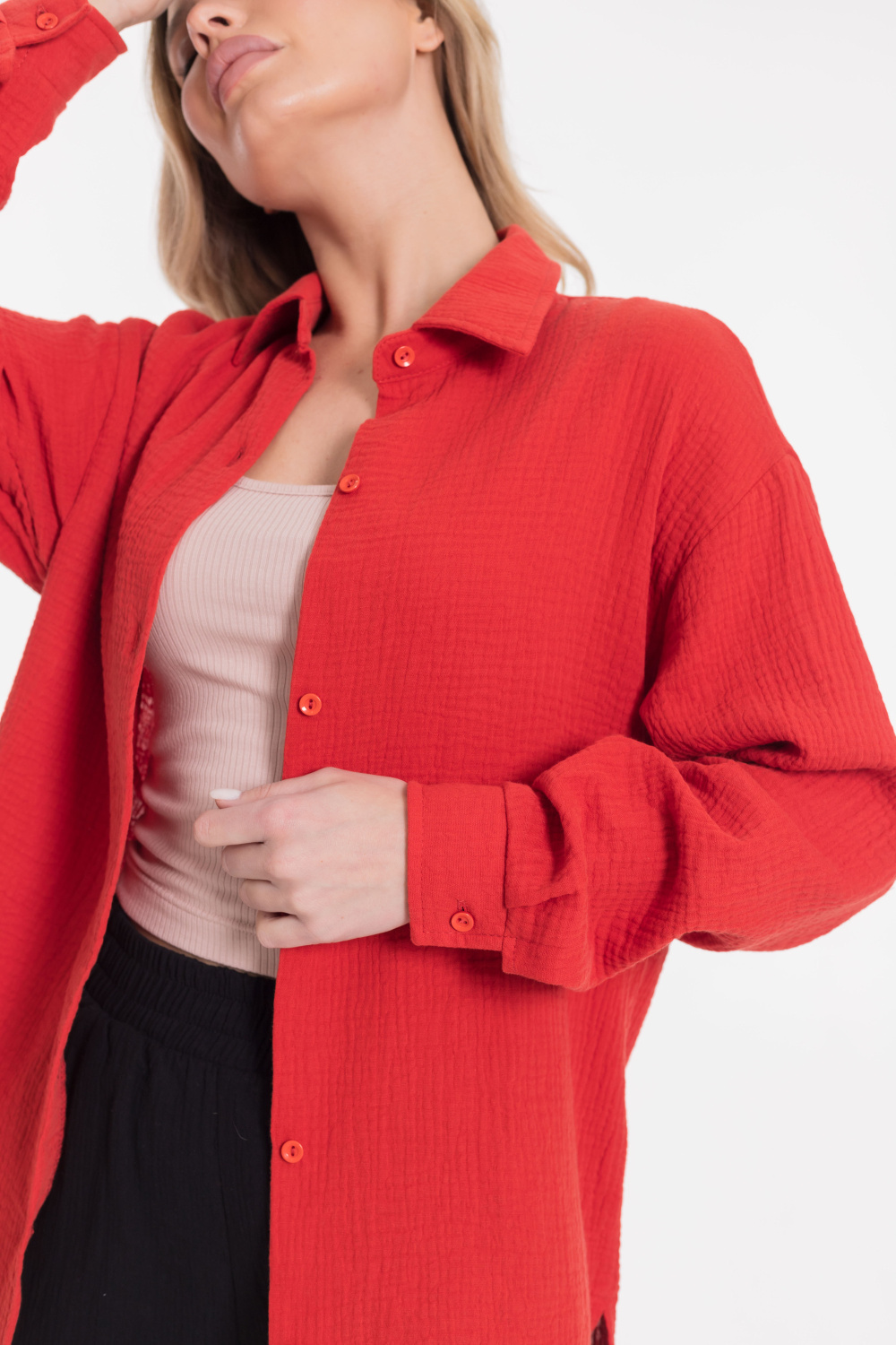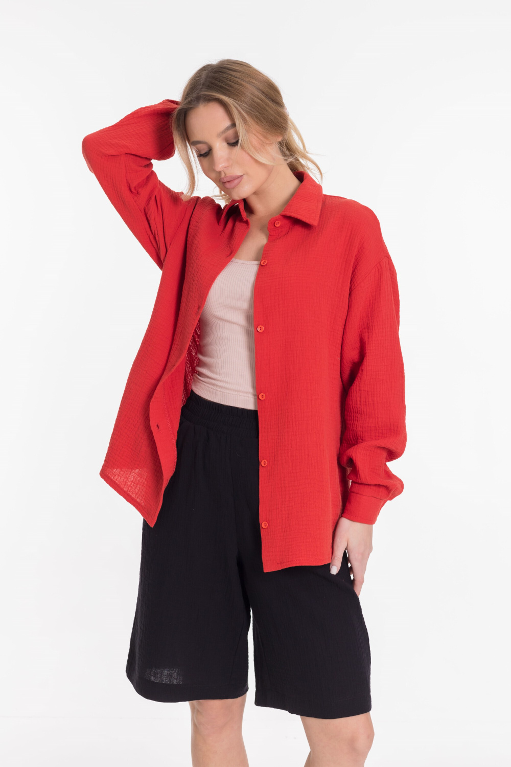 Женская рубашка — отличный выбор для повседневной носки. Она изготовлена из мягкого, лёгкого натурального материала — муслина. Рубашка имеет длинный спущенный рукав и застёжку на пуговицы. Воротник на отрезной стойке придаёт модели элегантность. В боковых швах есть небольшие разрезы, которые добавляют изюминку в дизайн. Такая однотонная рубашка идеально подойдёт для прогулок, отдыха или неформальных мероприятий. Она выполнена из качественного материала, который хорошо пропускает воздух и обеспечивает хорошую вентиляцию.