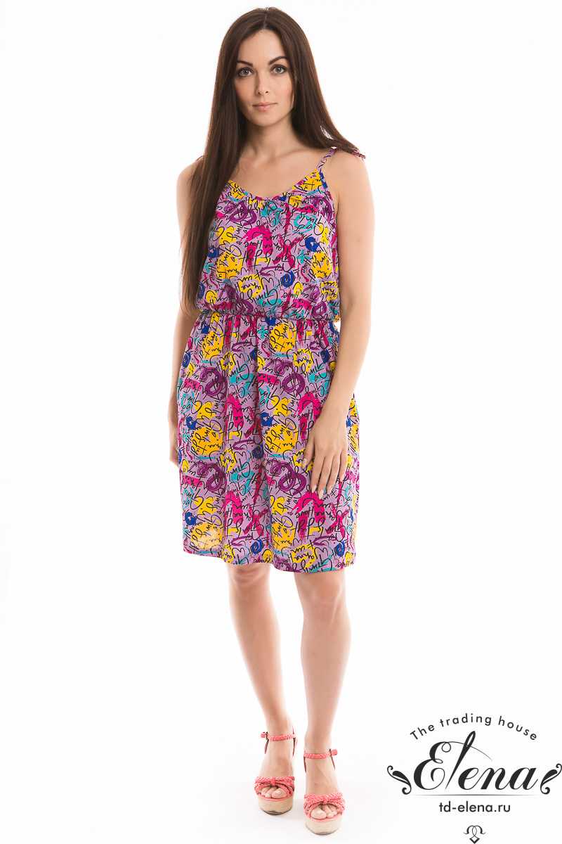 Сарафан на бретельках выполнен из х/б полотна с набивным рисунком. На резинке по талии и с карманами по бокам.