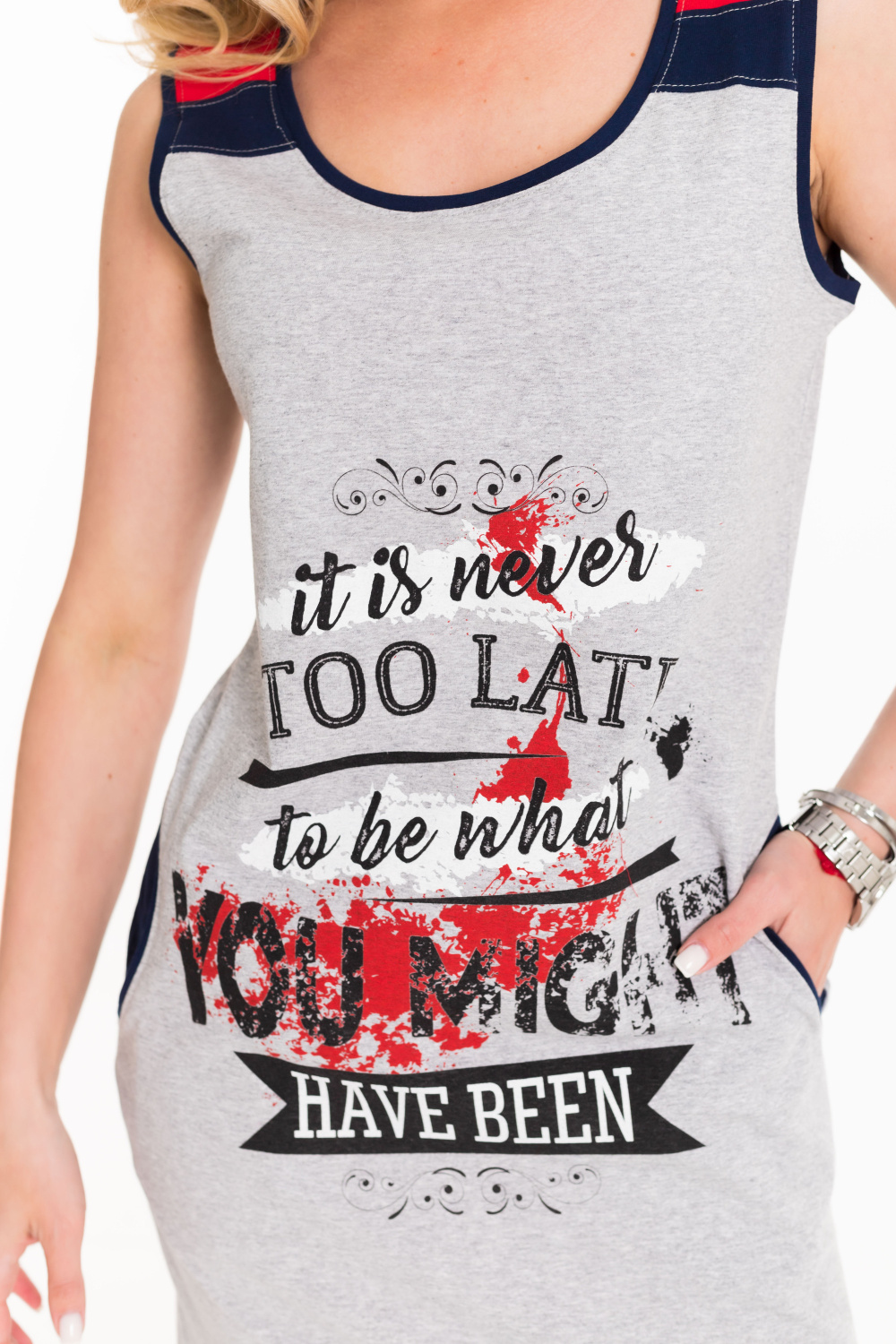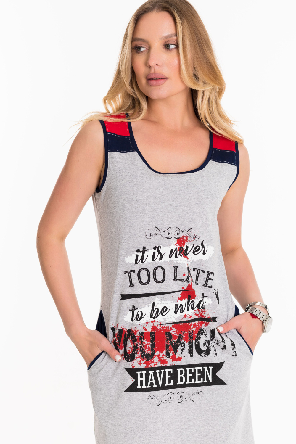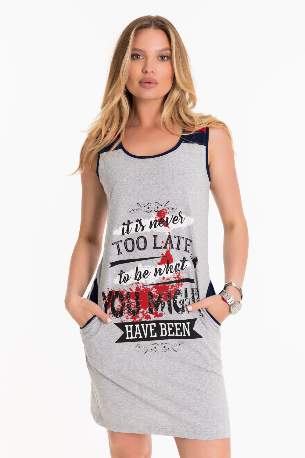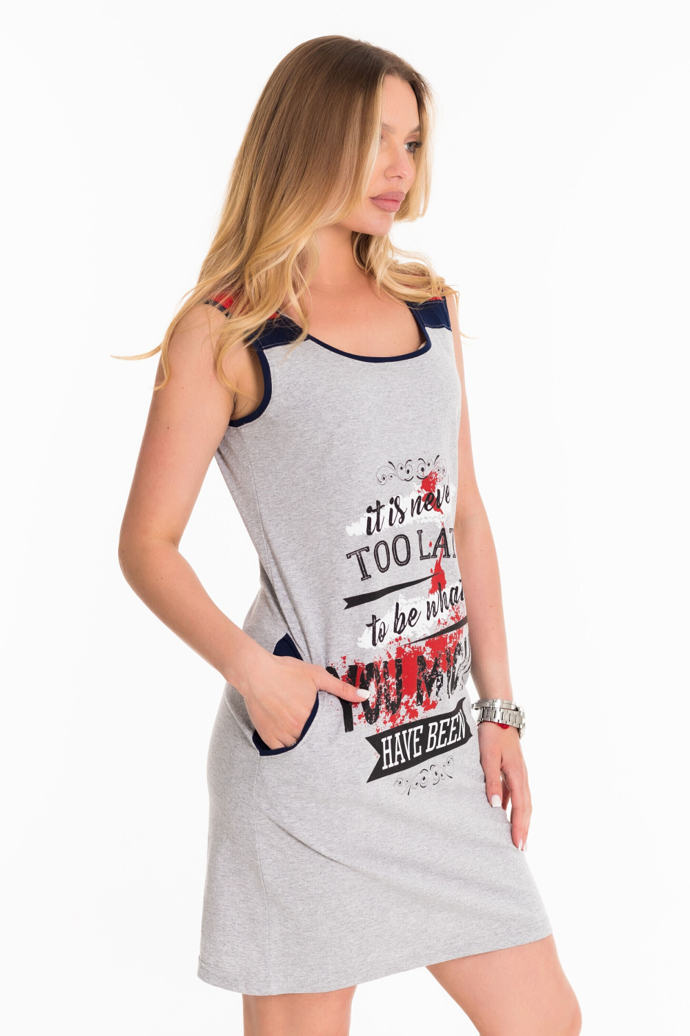 Сарафан на широких бретелях выполнен из хлопкового полотна. Спереди нанесён принт. По бокам размещены карманы.