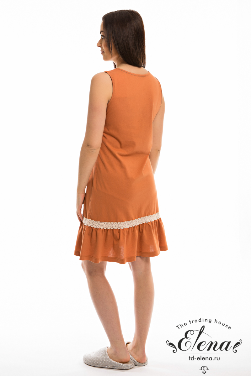 Сорочка из однотонной кулирки. По низу с оборкой и отделкой кружевом, спереди нанесён принт.