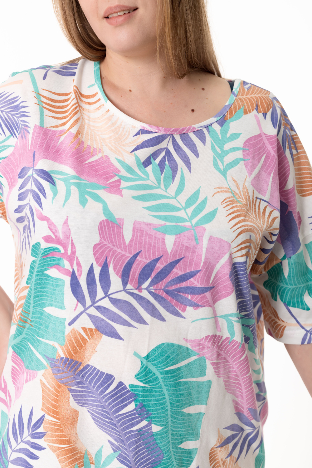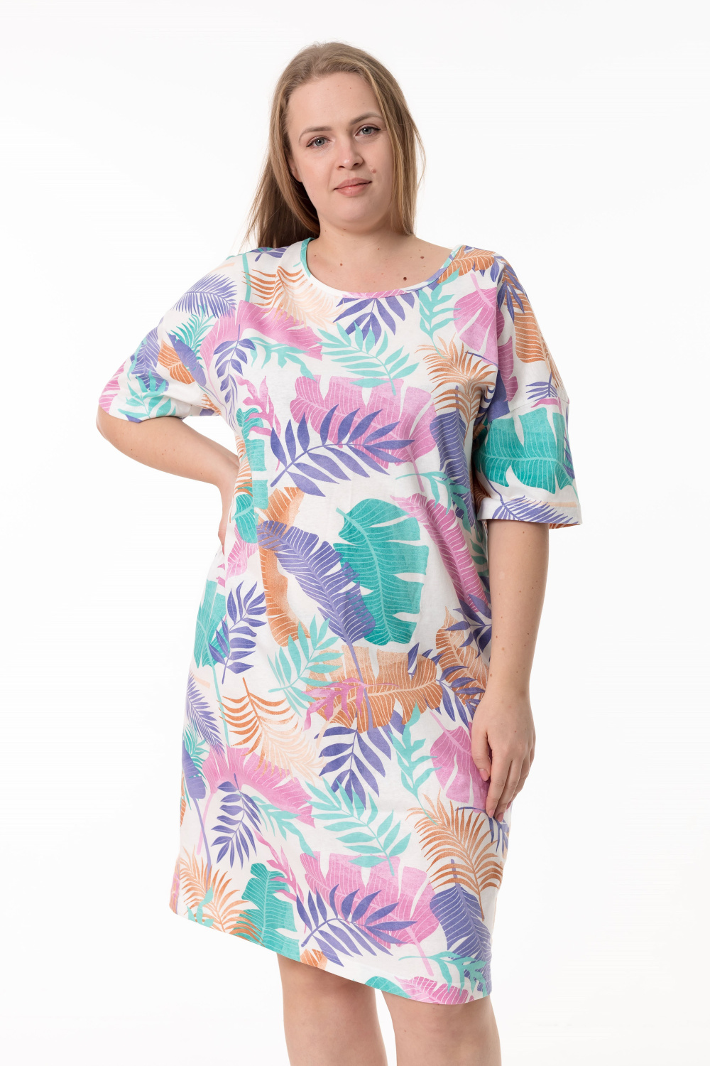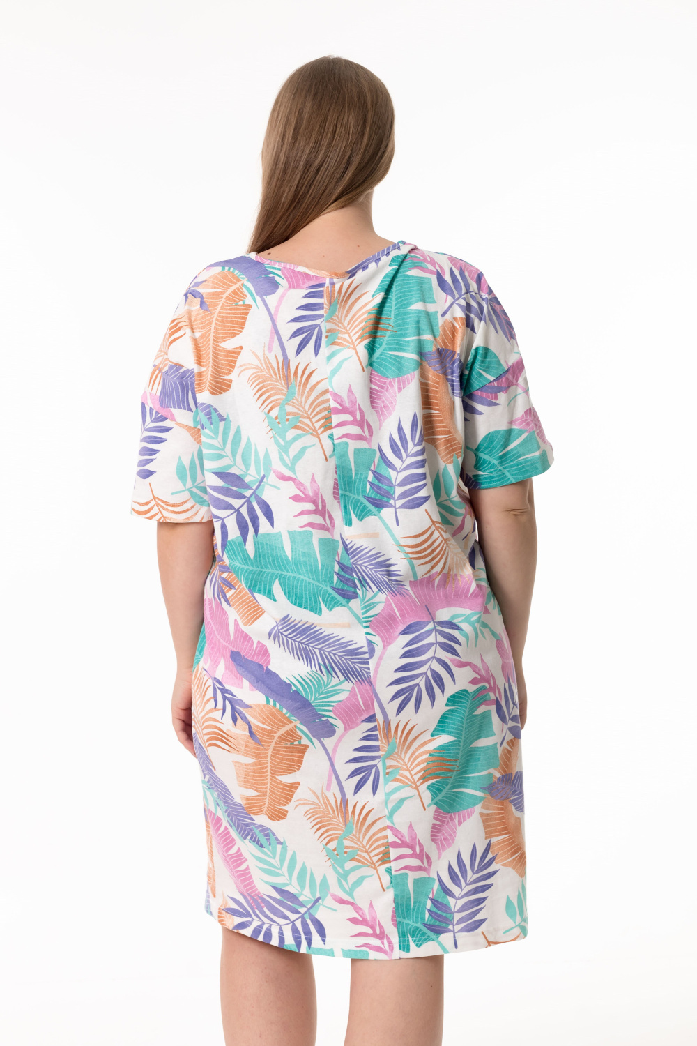 Сорочка выполненная из кулирки — женственная модель для комфортного отдыха. Модель свободного кроя, объёмная в верхней части и плавно зауженная к низу, с коротким спущенным рукавом. Горловина овальной формы аккуратно обработана контрастной бейкой. Длина сорочки до уровня колен создает удобный и лаконичный силуэт.