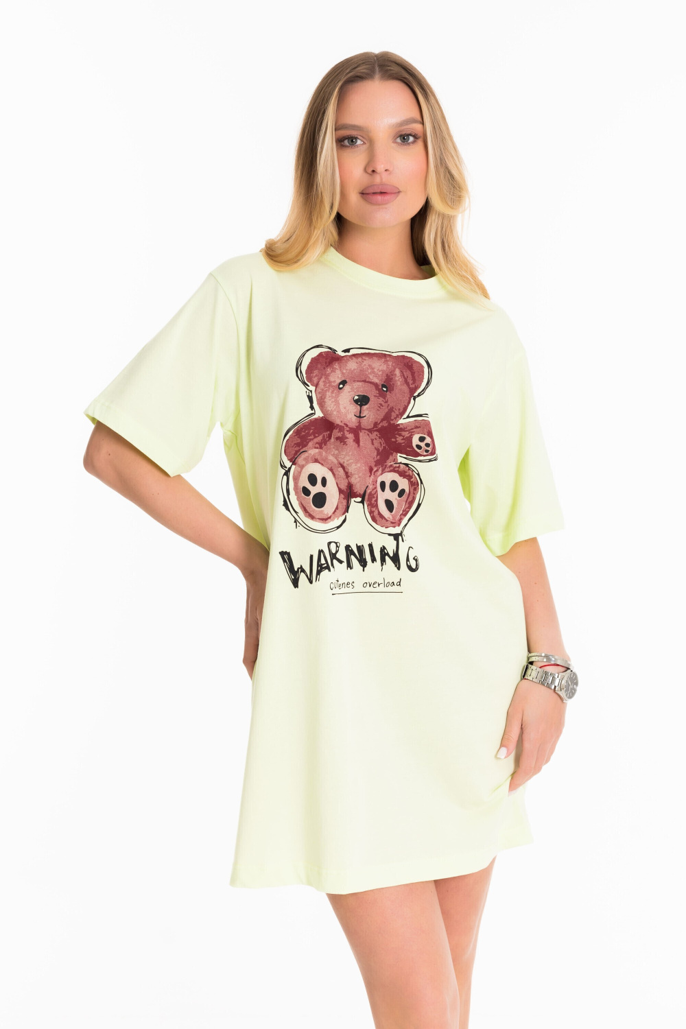 Сорочка-футболка выполнена из однотонной кулирки. С коротким рукавом и принтом спереди. Круглый вырез горловины оформлен планкой.