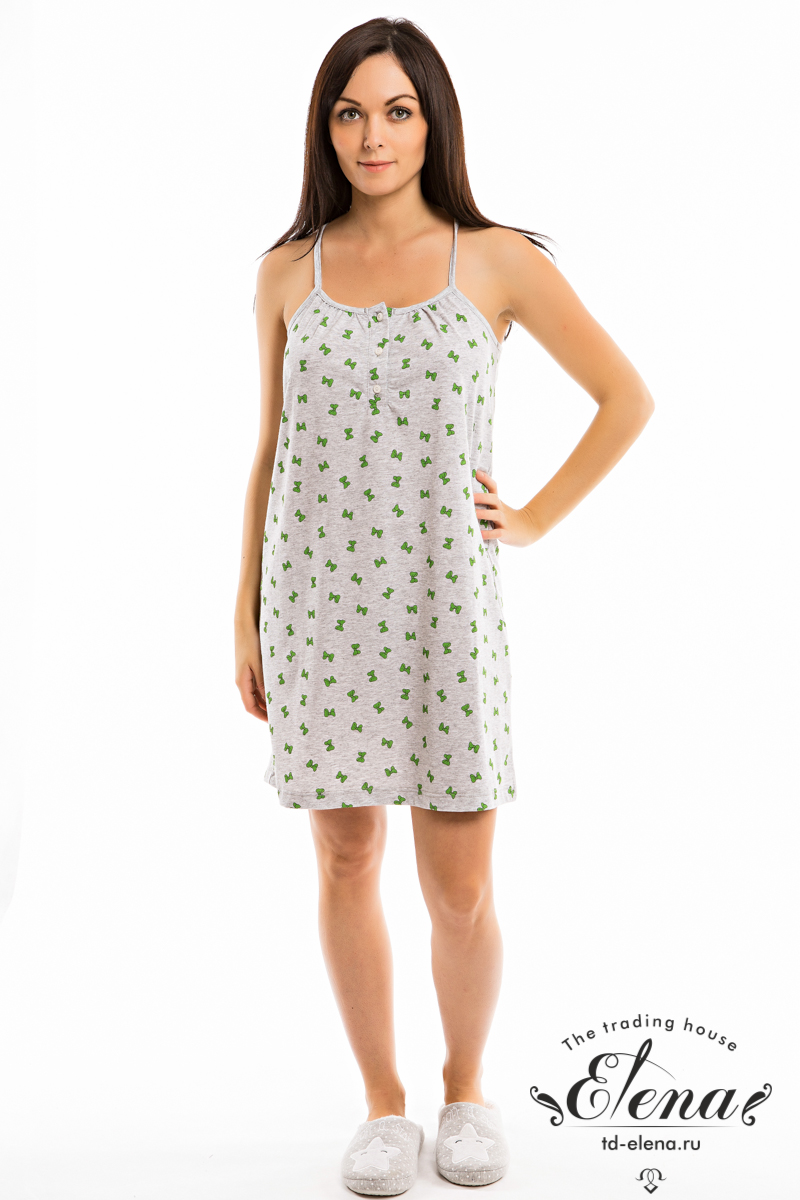Сорочка из кулирки на тонких бретелях. Силуэт сорочки свободный, на полочке небольшая планка с застёжкой на пуговицы и сборки на груди. Спинка оформлена борцовкой.