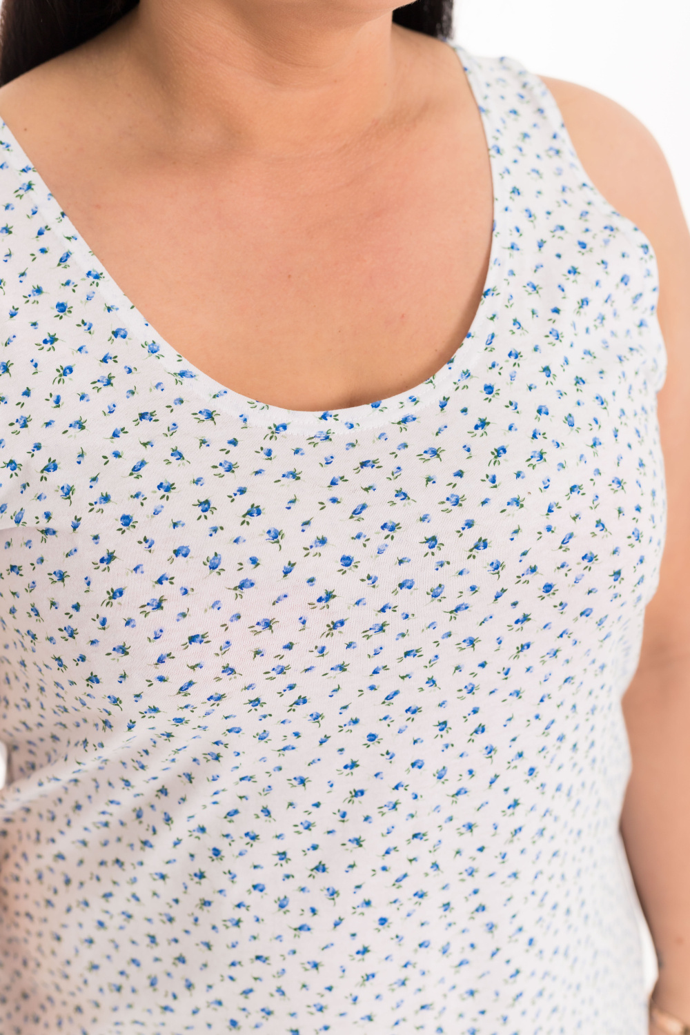 Сорочка выполнена из набивной хлопковой ткани. Покрой свободный, широкие бретели, вырез горловины круглый.