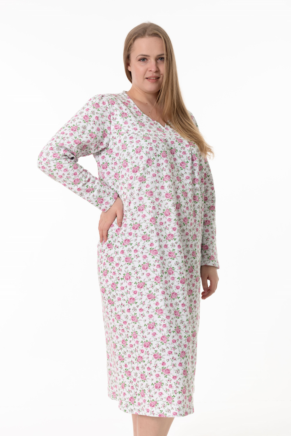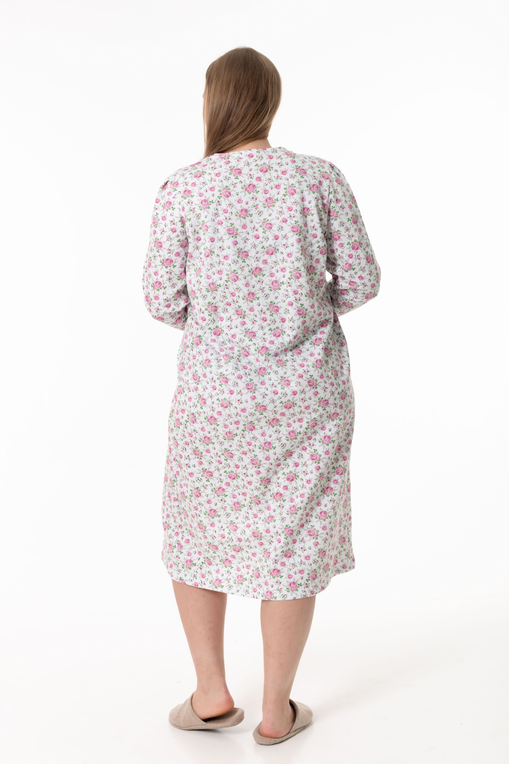 Сорочка свободного покроя из хлопковой ткани с начёсом. Рукава длинные, на круглой горловине декоративный вырез в форме галки.