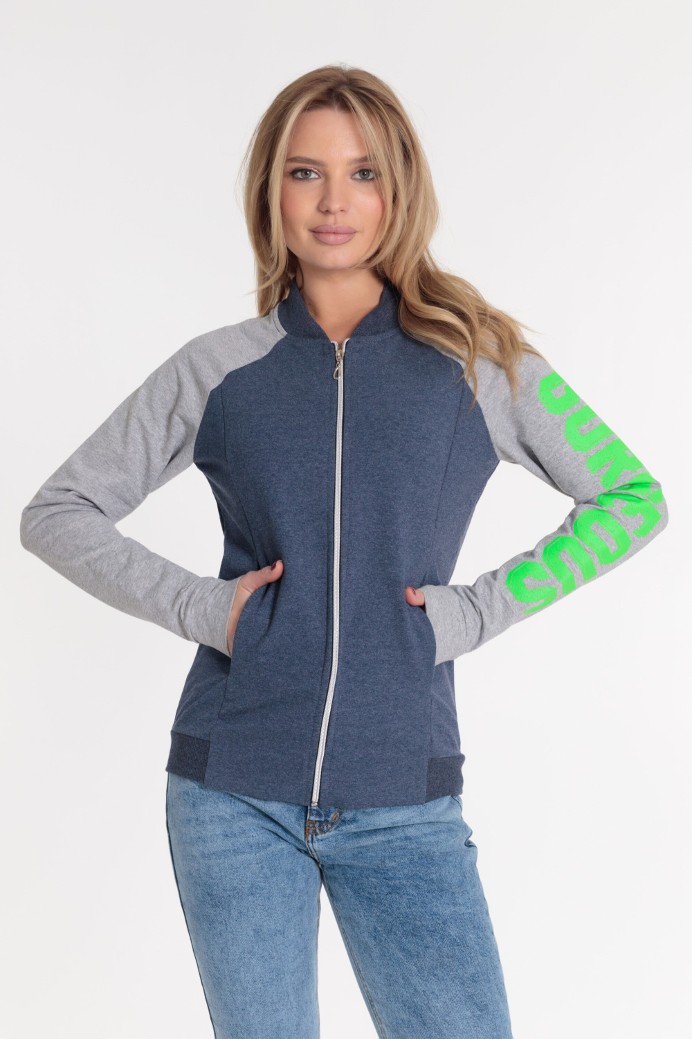 Толстовка выполнена из футер петли с лайкрой. Воротник и пояс из кашкорсе. Центральная застёжка на молнию. На спинке и рукаве нанесён принт.