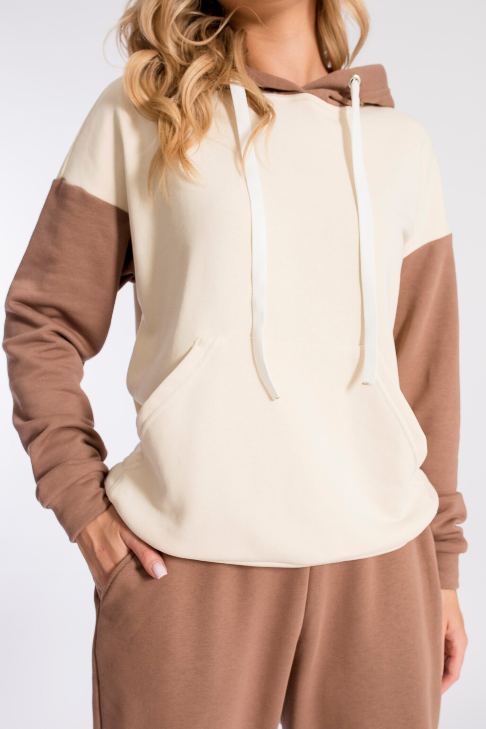 Женская толстовка выполнена из полотна футер трёхнитка (воздушка). Силуэт толстовки свободный, ширина капюшона регулируется шнуром. Линия плеча спущена, длинные рукава заканчиваются манжетами. Спереди располагается карман-кенгуру.