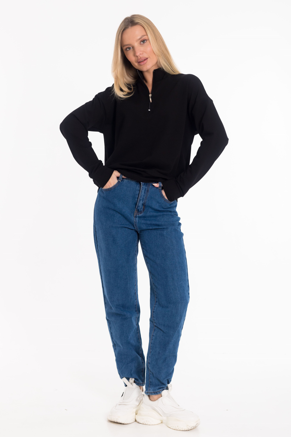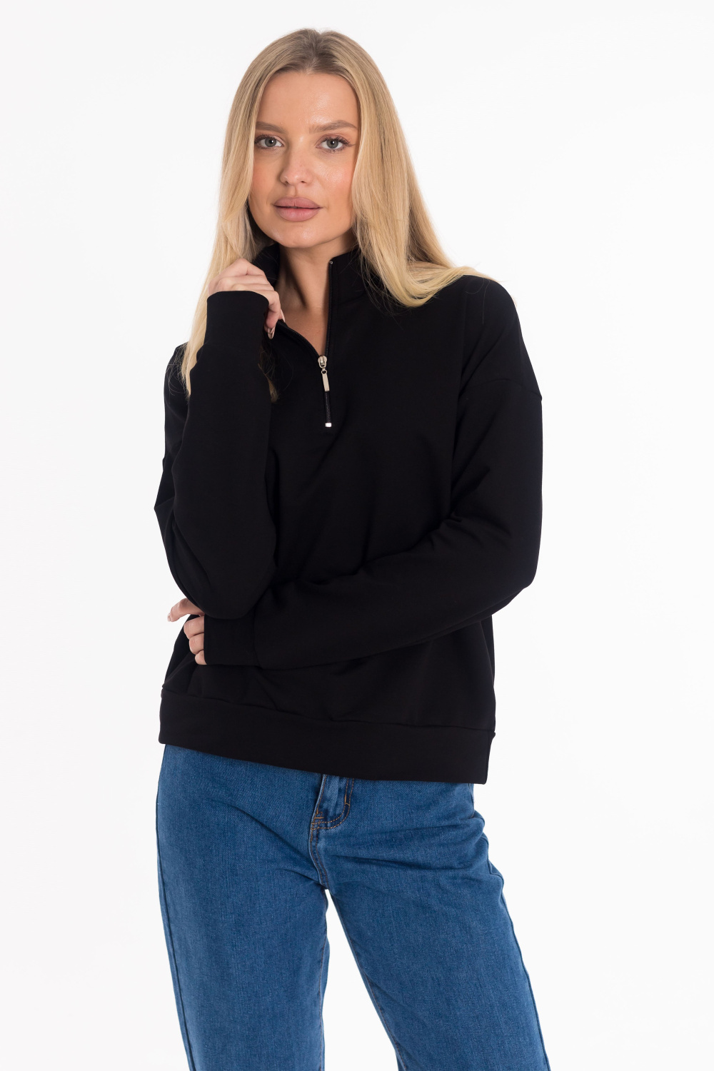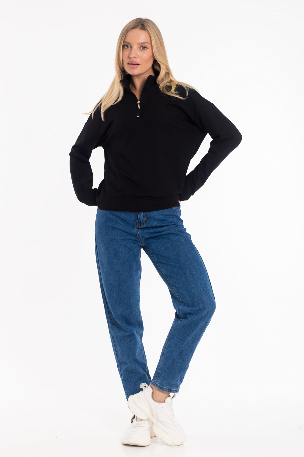 Стильная толстовка выполнена из футера двухнитки. Модель с удобной короткой застежкой на молнию и практичным воротником-стойкой, обеспечивающим дополнительное тепло и комфорт. Рукава дополнены манжетами из основного полотна. Низ изделия оформлен притачным поясом для аккуратной посадки.