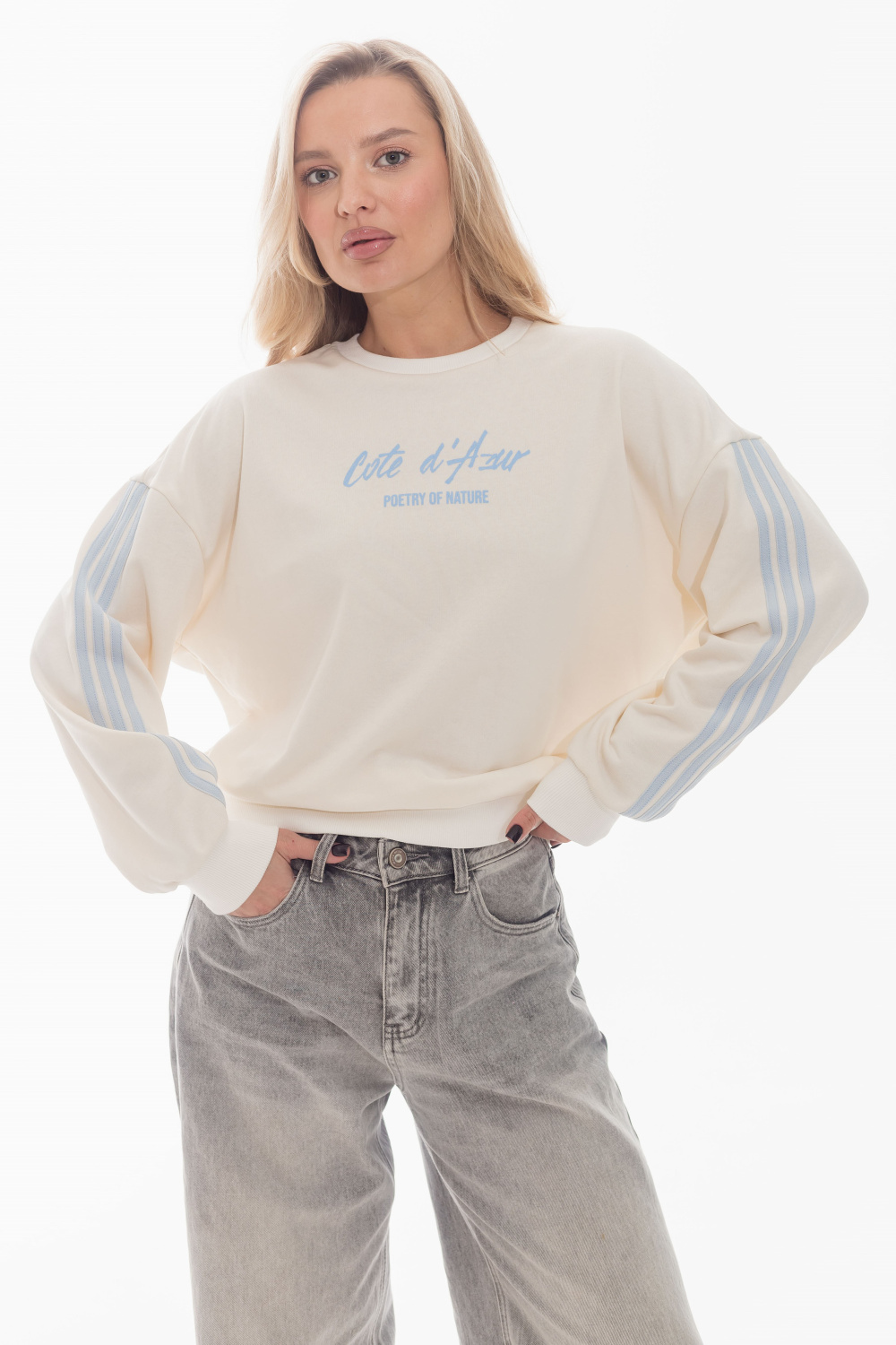 Женская толстовка выполнена из футера трехнитки «воздушка», что делает изделие мягким и комфортным в носке. Модель свободного кроя со спущенным рукавом обеспечивает удобство и стильный силуэт. Горловина, пояс и манжеты выполнены из эластичного кашкорсе для лучшей посадки. Рукава украшены лампасами, придающими образу динамичность, а спереди расположен аккуратный принт, добавляющий яркий акцент. Отличный выбор для повседневных образов.