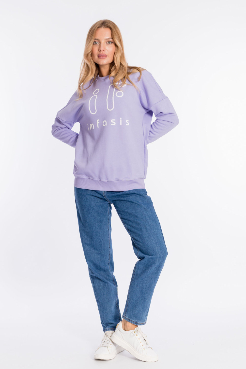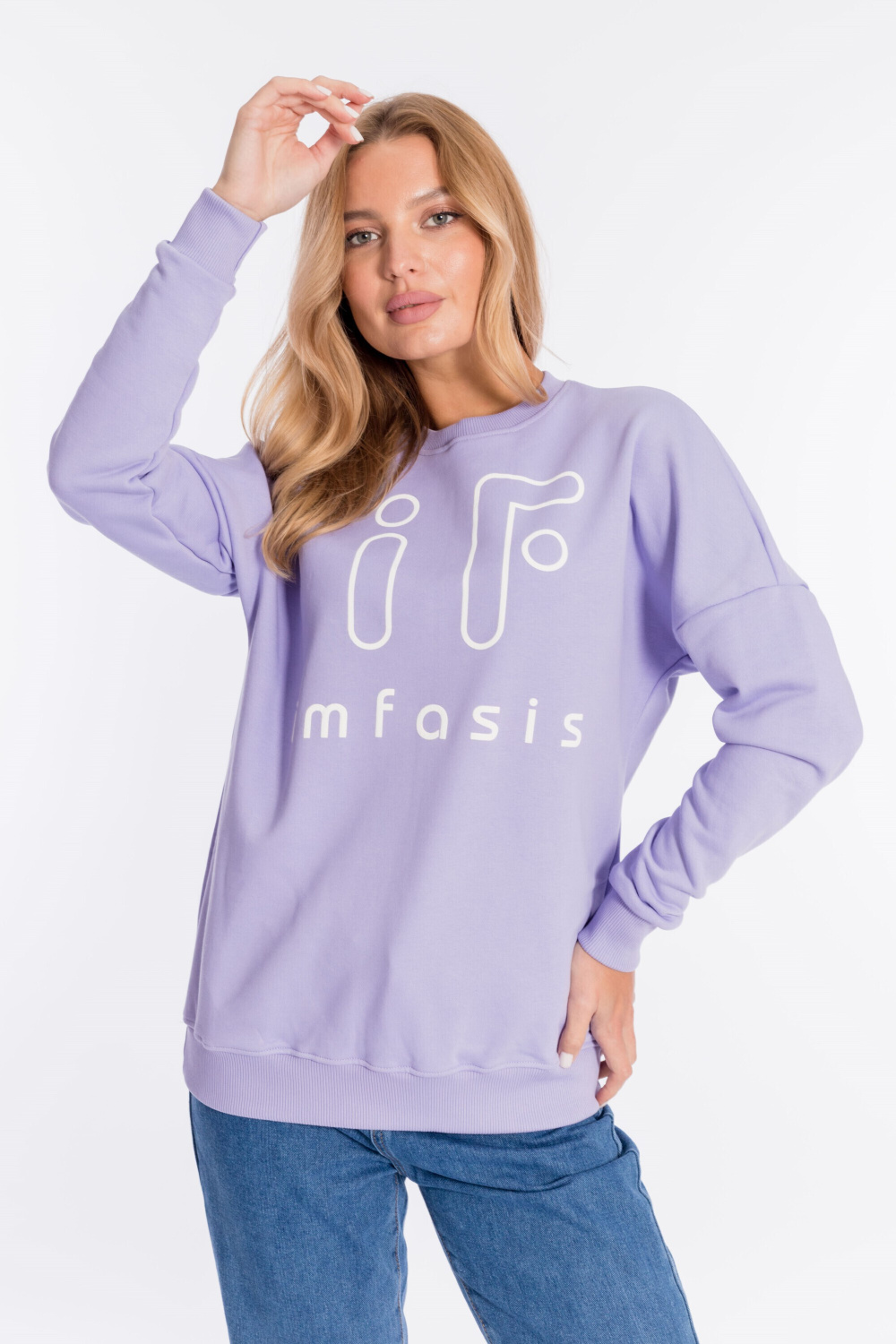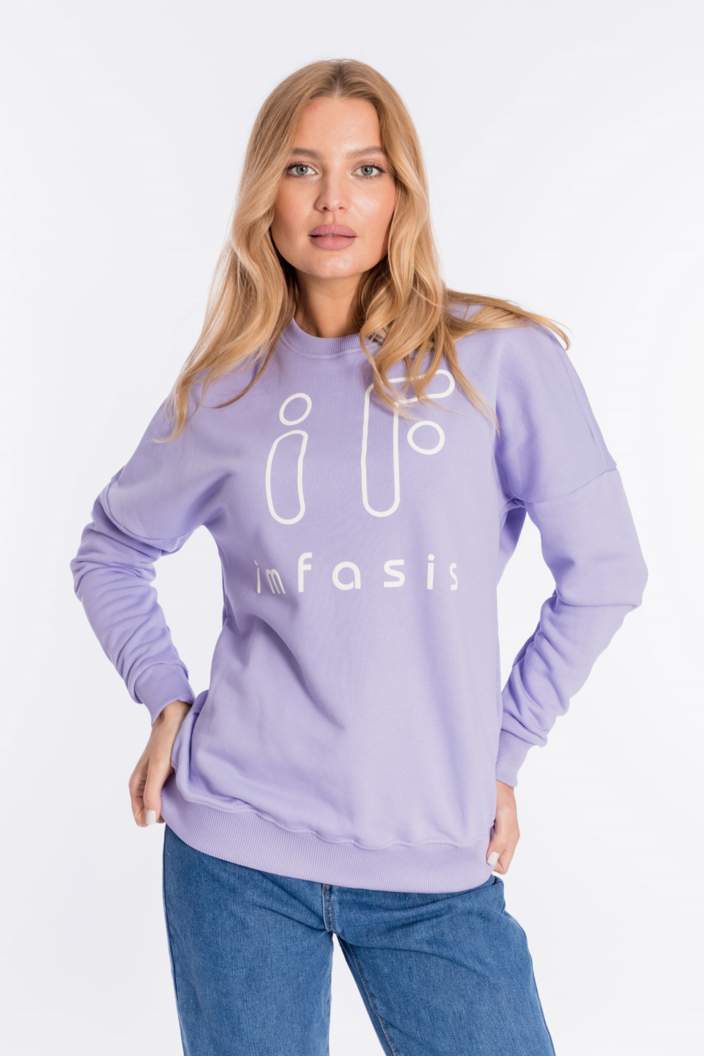 Толстовка свободного силуэта выполнена из футер петли (трёхнитка воздушка). Линия плеча спущена, спереди нанесён принт. Пояс и рукава с манжетами из кашкорсе.