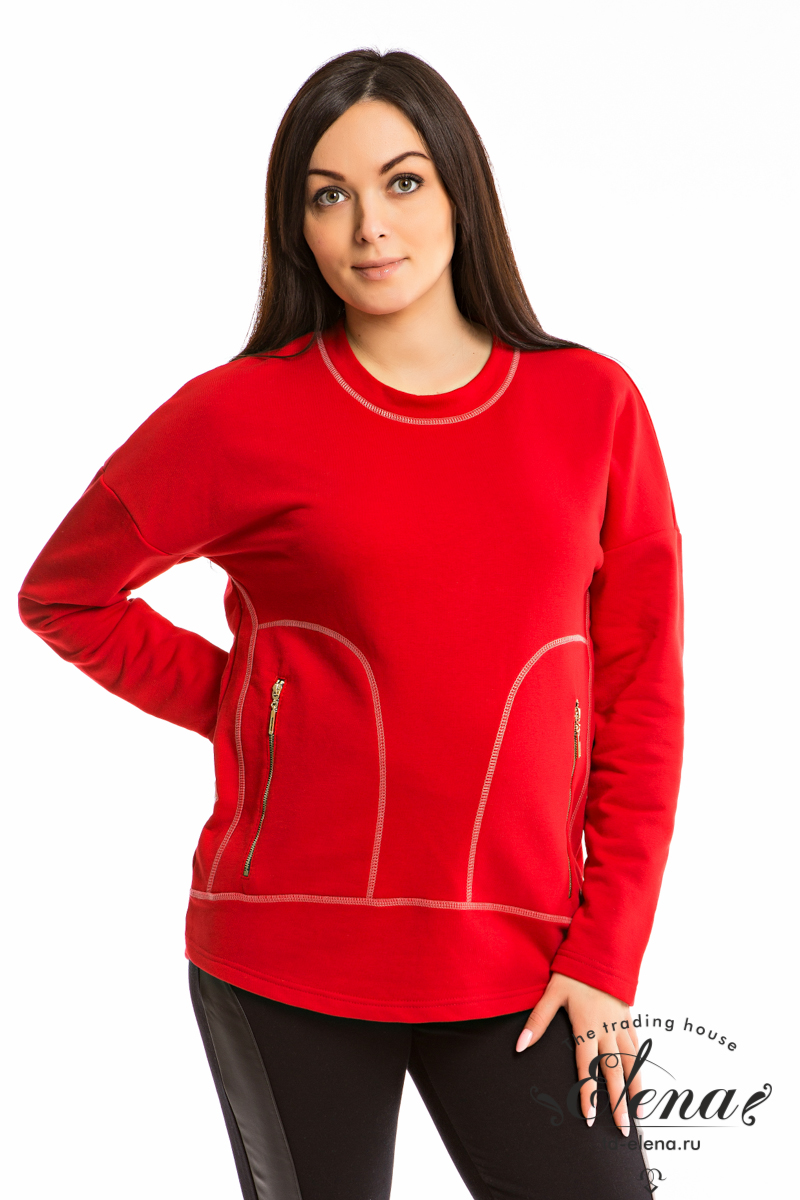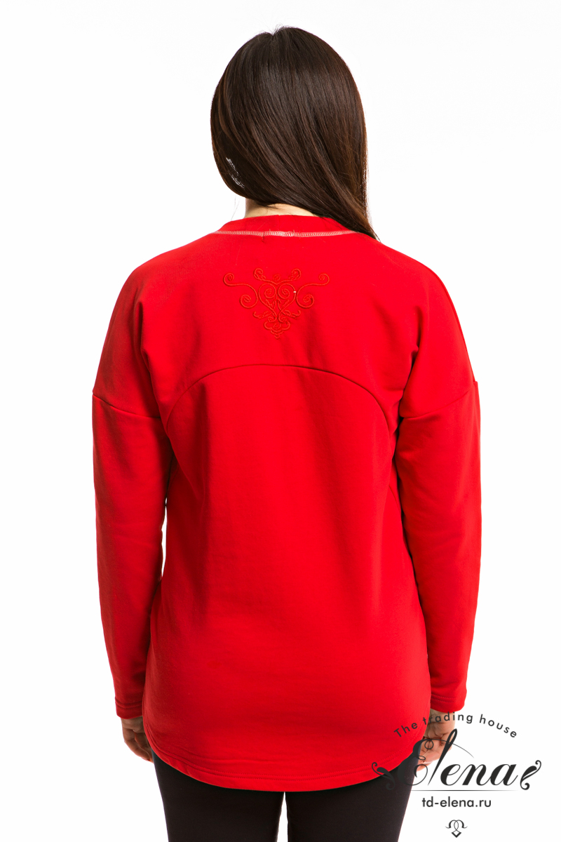Толстовка выполнена из однотонного футера трёхнитки (воздушка) в красном цвете. Горловина с круглым вырезом, рукава длинные, со спущенным плечом. Спереди размещены карманы с металлическими молниями. На спинке расположена вышивка.