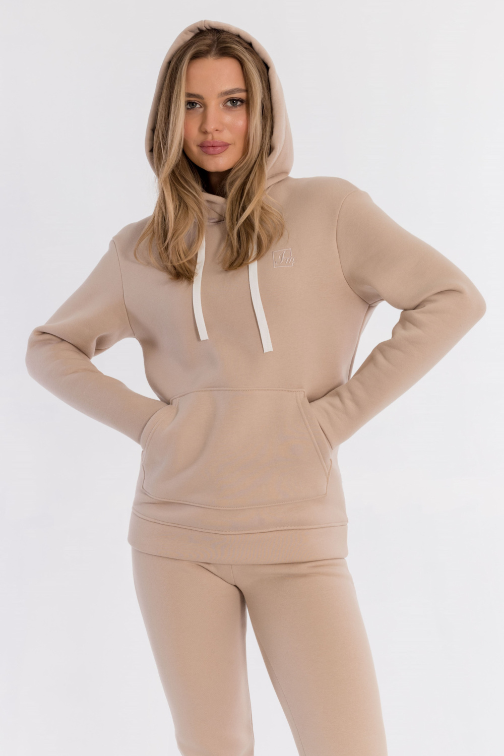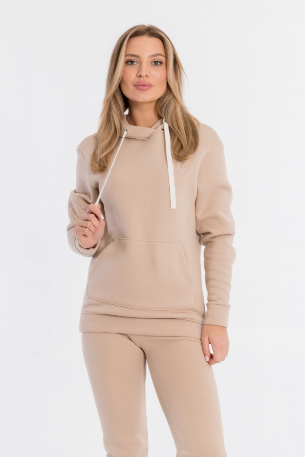 Толстовка выполнена из полотна c начёсом (футер трёхнитка). Капюшон со шнуром. Спереди расположена вышивка и карман-кенгуру.