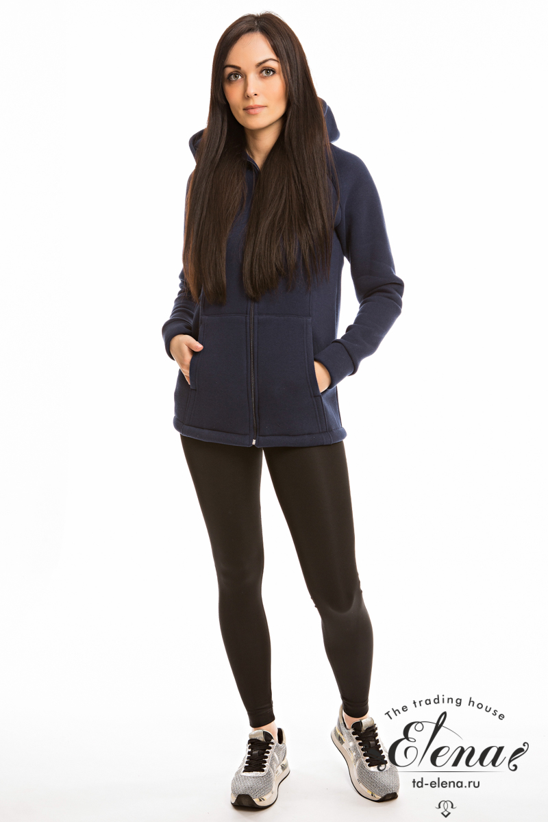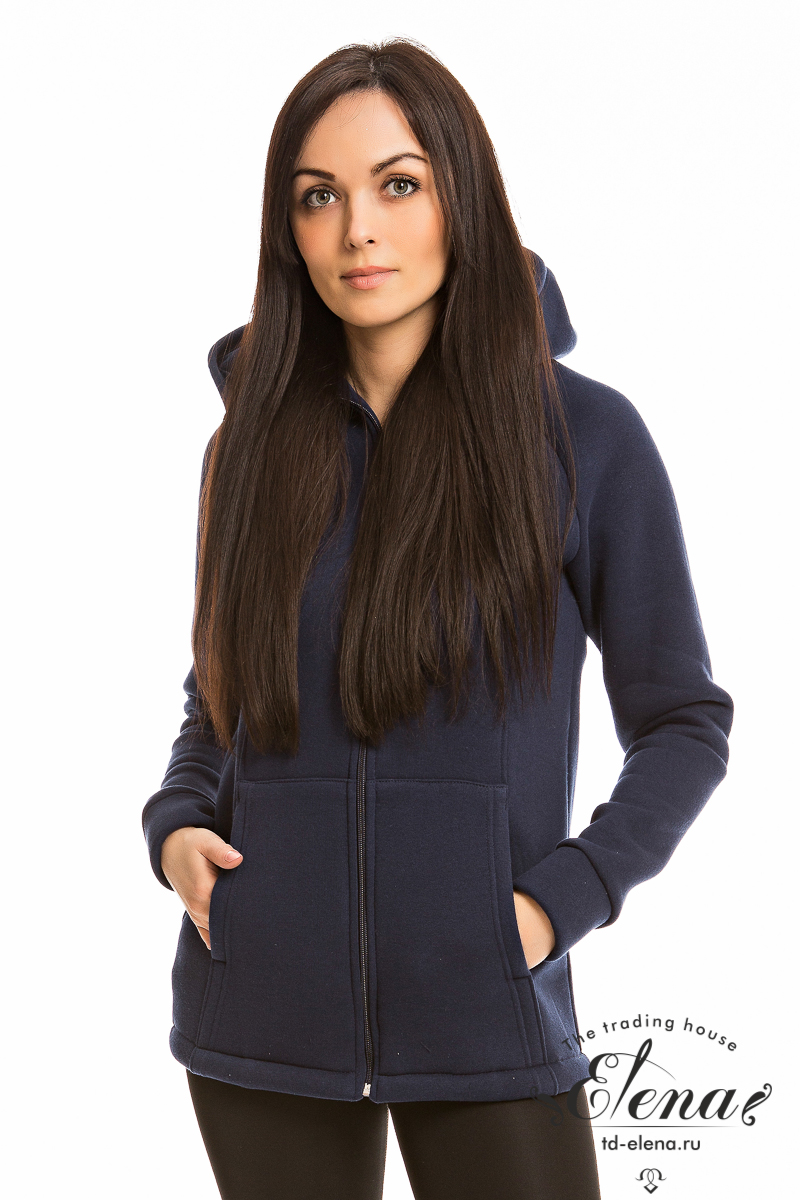 Женская толстовка, с центральной застёжкой на молнию, выполнена из полотна с начёсом. В модели предусмотрен капюшон. Длинные рукава покроя реглан на манжетах внизу, по бокам расположены карманы.