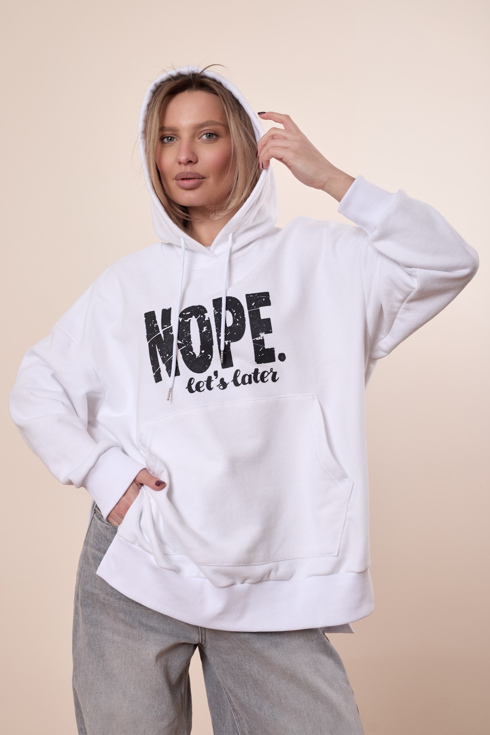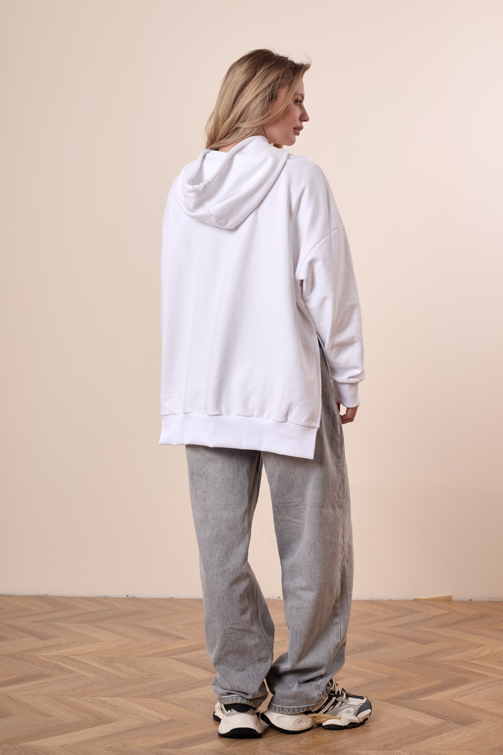 С капюшоном, со спущенным рукавом, к карманом-кенгуру на полочке. Полочка короче спинки, в боковых швах разрезы. Манжеты и пояс из кашкорсе в цвет основного полотна. На полочке принт.