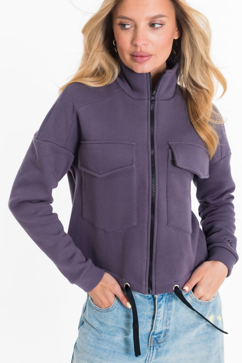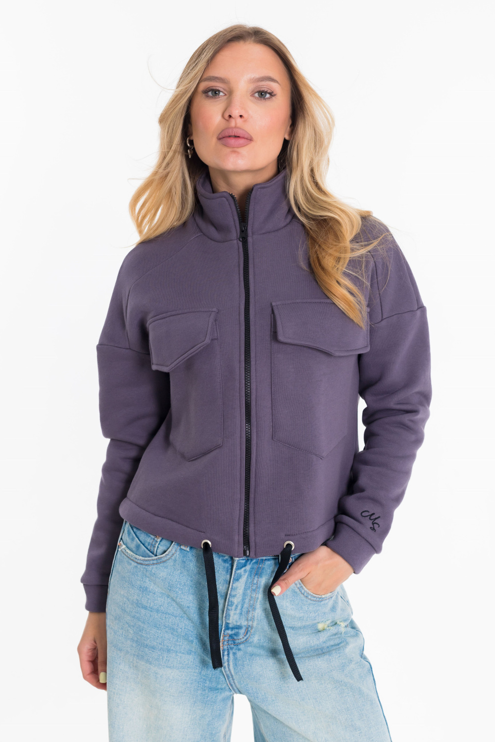 Тёплая, модная женская толстовка выполнена из полотна с начёсом (футер трёхнитка). Воротник-стойка, длинные рукава заканчиваются манжетами из основного полотна, на левом рукаве размещена вышивка. Толстовка застёгивается на молнию, спереди в верхней части размещены карманы с клапанами. Такая толстовка подойдёт для создания стильных и комфортных образов на каждый день.