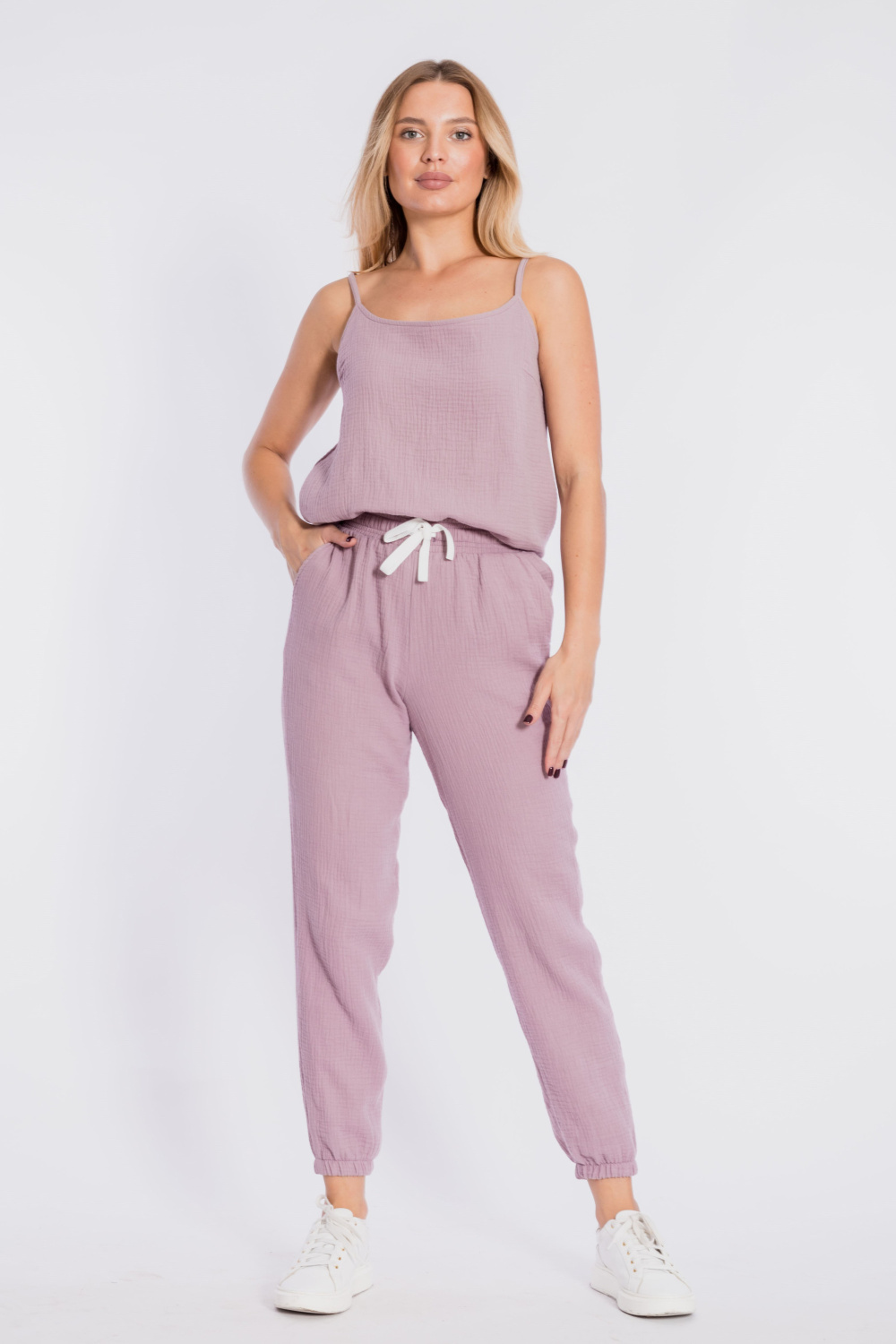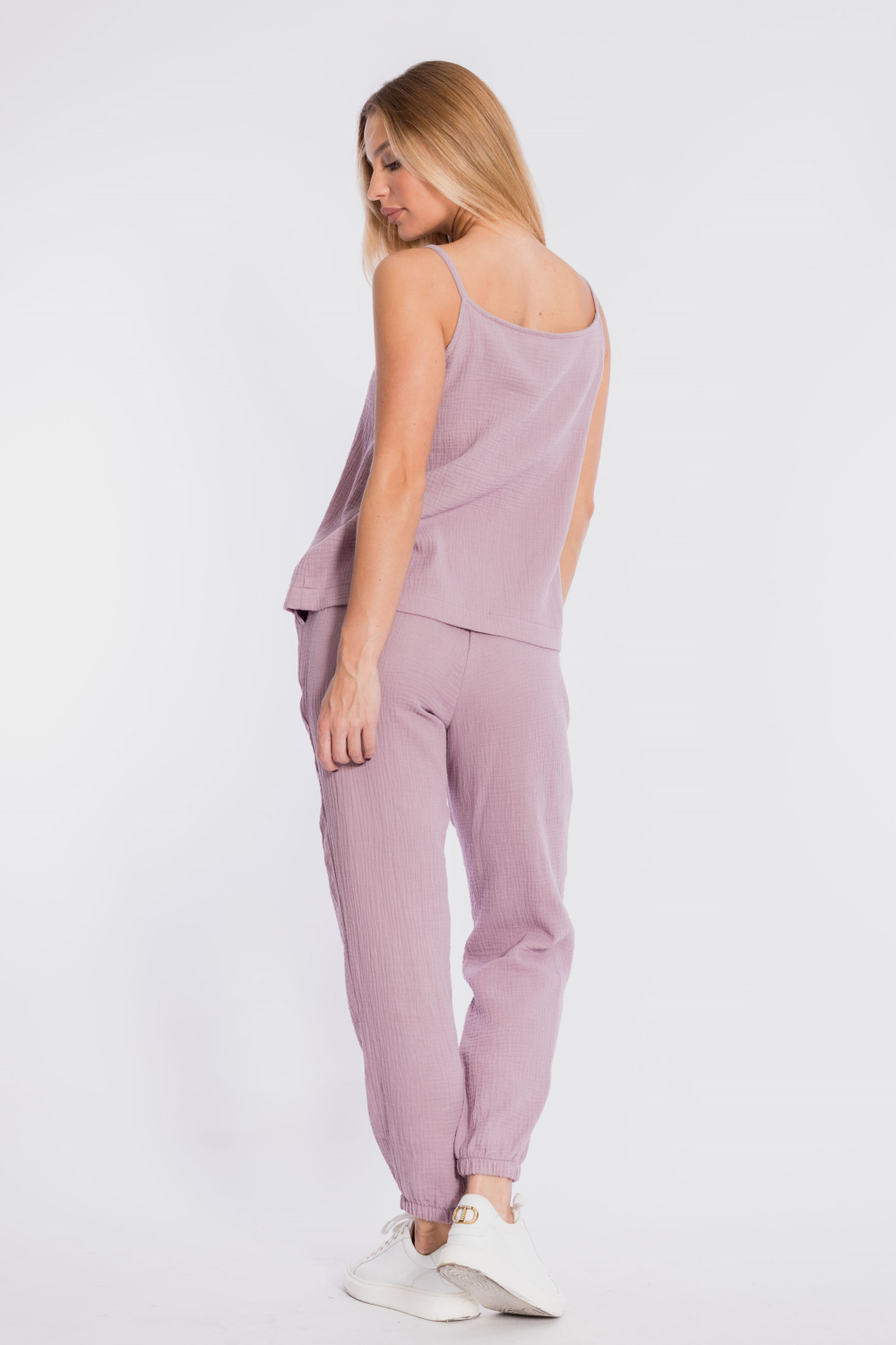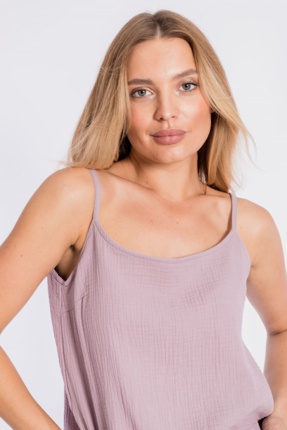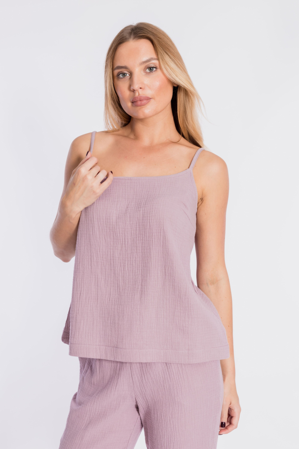 Топ свободного силуэта на тонких бретелях выполнен из хлопкового полотна - муслина.