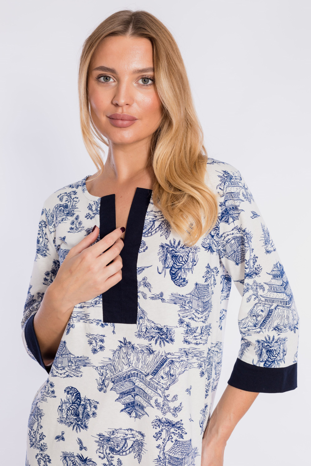 Туника выполнена из кулирки с набивным рисунком, с однотонными отделочными планками горловины и манжетами на рукавах. Рукава длиной 3/4, низ туники закруглённый спереди и сзади.