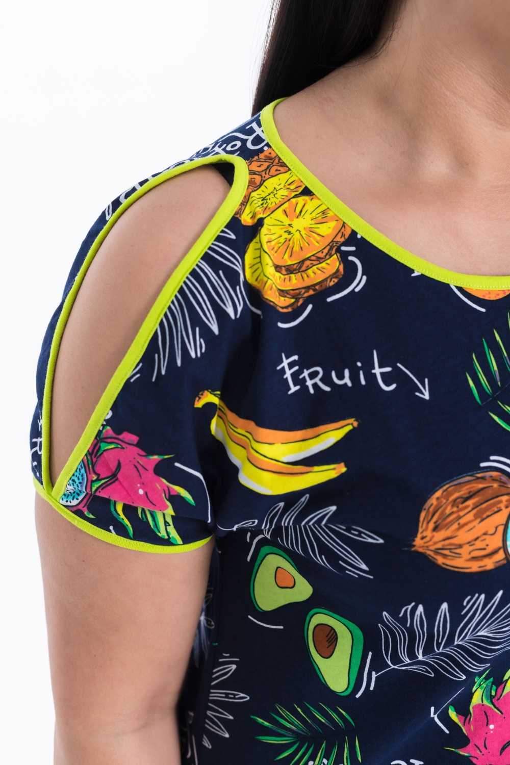 Туника имеет свободный крой, который не сковывает движений. Рукава декорированы разрезами, что придаёт модели оригинальность. Низ рукавов и туники, а также горловина обработаны бейкой из контрастного полотна, что добавляет изделию аккуратности и завершает образ.