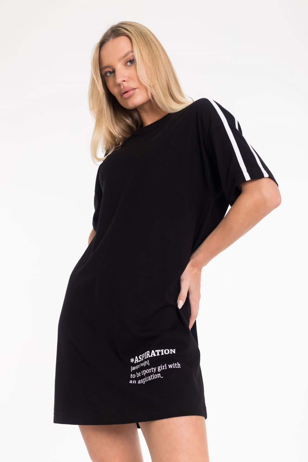 Туника женская из хлопкового полотна. Модель выполнена в лаконичном дизайне с короткими рукавами и классическим круглым вырезом горловины. Особенность модели — контрастные лампасы на рукавах, добавляющие спортивный акцент. Низ переда украшен принтом, создающим динамичный образ. Практичный вариант для прогулок, отдыха и спортивного стиля.